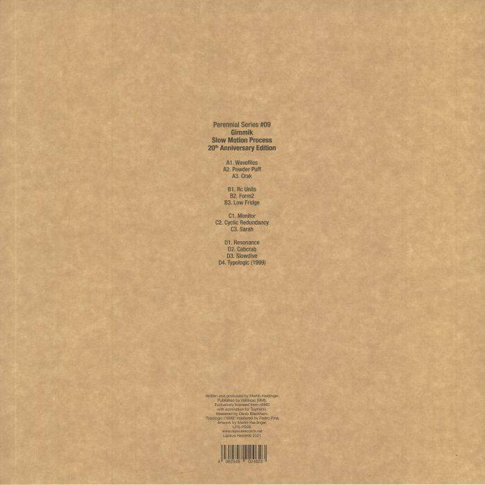 In 2019 Lapsus were extremely honoured to present the only album to date from IDM duo Abfahrt Hinwil, released for the first time on vinyl. Abfahrt Hinwil is formed by two good friends Martin Haidinger and Chris Cunningham, who as well as collaborating on musical projects were also responsible for the now defunct Toytronic label. Today, Lapsus welcomes back Martin Haidinger AKA Gimmik, the pseudonym under which Haidinger has been releasing intricate and exquisite electronic music since the late 1990s. The Austrian producer's album 'Slow Motion Process' is his best-known work to date and was released in 2001 on the Worm Interference label. It's sound is very reminiscent of Abfahrt Hinwil's album 'Links Berge Recht Seen': combining elements of subtle braindance, glitch-tinged electronic music, floating between analogue and digital; exceptional IDM that still sounds as contemporary as when it was first released. Lapsus Records celebrates the 20th anniversary of 'Slow Motion Process' with the release of a deluxe edition that includes artwork updated and designed by Martin himself, as well as the unreleased track 'Typologic (1999)' -only available on the vinyl version.
