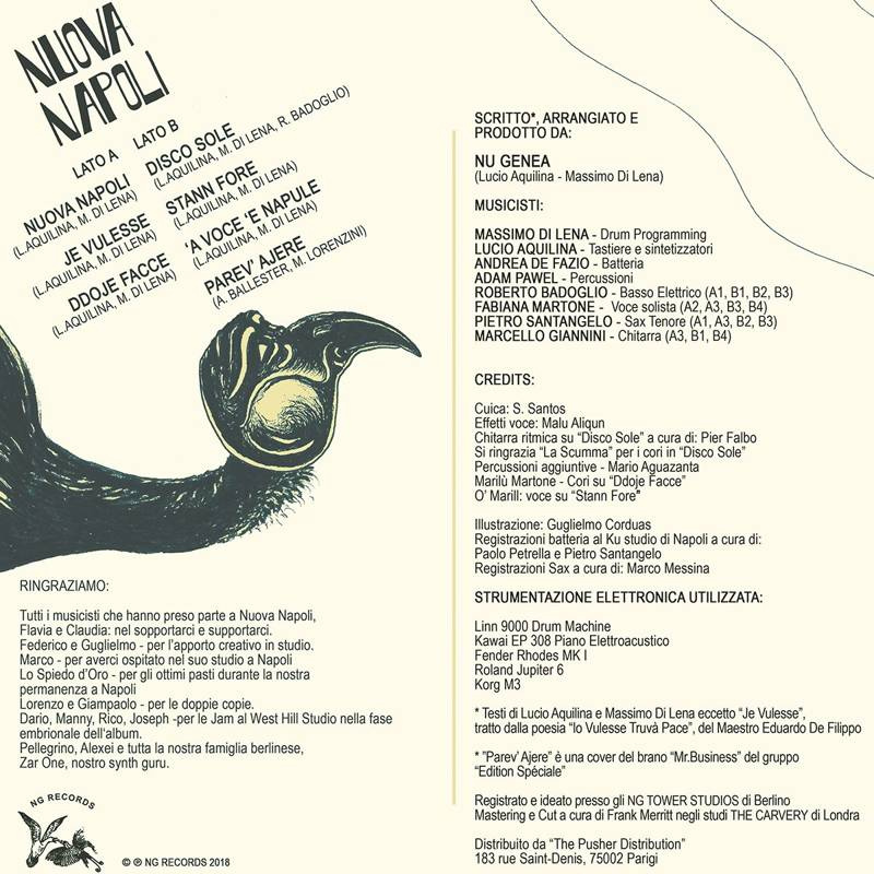After touring the world looking for sounds suitable for their vibrations, NU GENEA (Nu Guinea) decided to go back to square one, Napoli, where Massimo Di Lena and Lucio Aquilina were born and raised. They watched their city from a distance reconstructing its energy from their studio in Berlin, calibrating the synths on the meridian of Vesuvius, the volcano that has always protected and threatened Napoli.