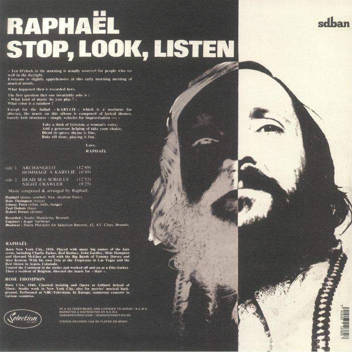 His album 'Stop, Look, Listen', which was recorded with the rhythm section of Babs Robert's group, consists of four long genre-defying tracks colored by the dreamlike vocals of opera singer Rose Thompson. A surreal blend of genres, hard to pin down. It's highly imaginative jazz, that much is sure. Raphaël shifts from serene late night piano jazz to more free or even spiritual passages, magnificently paired with the otherworldly vocals of Rose Thompson. The LP was put out by Selection Records, a label that primarily issued library music at the time, and thus went largely unnoticed upon release. The recording makes clear that Phil Raphaël was a highly gifted artist whose talent will forever remain undervalued, since it was his only effort as a leader. Raphaël's passage through the Belgian nightlife was just as mysterious as his music, and few people seem to remember him. Drummer Bruno Castellucci describes him as remarkable, both as a musician and as a person: "He was a hippie before there were hippies. He wasn't part of the system but he had a system of his own."