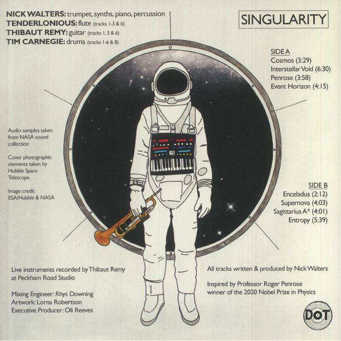 Nick Walters returns to his D.O.T. Records imprint with a suite of forward thinking, cosmic, electronic-jazz experiments, inspired by NASA & the concept of gravitational singularity. Each track on “Singularity”, his first home studio produced album, is built around an audio sample recorded by NASA in space, then expertly transported back to earth by Walters via some magical trumpet and synth work on his newly purchased Juno-106. The album features key contributions from Ruby Rushton drummer Tim Carnegie, 22a Music’s Tenderlonious on flute and some sublime guitar work from Thibaut Remy.