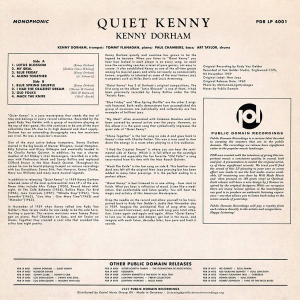 “Quiet Kenny” is a jazz masterpiece. Recorded by the great Rudy Van Gelder with a group of musicians playing at the top of their game, this title continues to be one of the most collectible Jazz LPs due to its high demand and short supply.