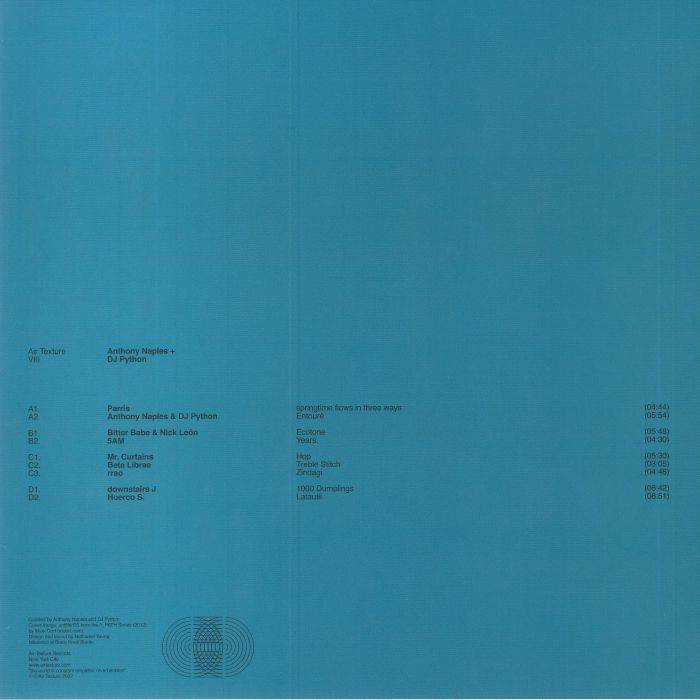 Two key pushers of New York tactile ambient-techno, Anthony Naples and DJ Python, here present a fittingly named compilation (and the third in the series) curating only the best found in that style and scene: 'Air Texture VIII'. Spurred on by a cost of living crisis in Manhattan, areas further afield in neighbouring Brooklyn have become much more central to artists such as Beta Librae, Downstairs J and 5AM, spurring their rise and that of producers like them. Don't miss this important chronicling of the scene, which still unfolds in real time.