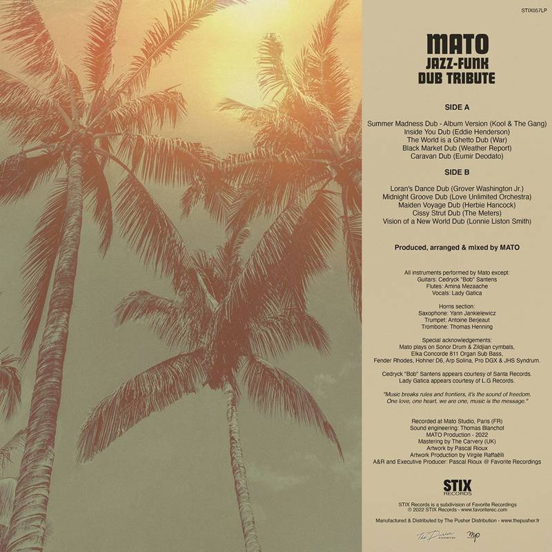 We all remember the melodies from Eddie Henderson ("Inside You"), WAR ("The World Is A Ghetto"), Weather Report ("Black Market"), Deodato ("Caravan"), Grover Washington Jr. ("Loran's Dance"), Barry White's Love Unlimited Orchestra ("Midnight Groove"), Herbie Hancock ("Maiden Voyage"), The Meters ("Cissy Strut") or Lonnie Liston Smith ("Visions Of A New World"). Imagine them reworked and tailored by the French dub master. Needless to say, Mato, who’s playing most instruments and synthesizers, did a fantastic job and you’ll be blown when hearing these versions.