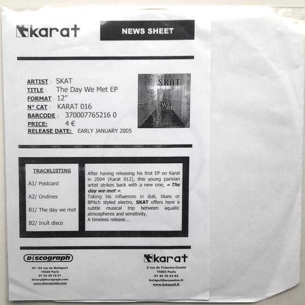After having released his first EP on Karat012, this young parisian artist strikes back with a new EP, 'The day we met '.Taking his influences in dub, blues or BPitch styled electro, SKAT offers here a subtle musical trip between aquatic atmospheres and sensitivity. A timeless release.