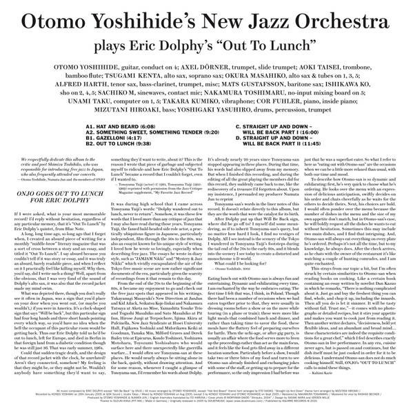 Otomo Yoshihide first came to international prominence in the 1990s as the leader of the experimental rock group Ground Zero, and has since worked in a variety of contexts, ranging from free improvisation to noise, jazz, avant-garde and contemporary classical. The always surprising and sometimes confounding turntablist, sound artist, onkyo improviser and now avant jazzer heading up a 15-piece aggregation of Japanese and European experimentalists. Who better to grapple with Dolphy's legacy -- so idiosyncratic in its day and yet so influential to creative improvisers who followed -- than a musician with his own singular take on how sounds can be organized in the jazz realm over 40 years later and half a world away? In other words don't expect the conventional from Otomo any more than you would from Dolphy himself. That's not to say that recognizable themes ("Hat and Beard," "Out to Lunch," "Straight Up and Down") don't appear, or that individual players -- including Alfred Harth on bass clarinet bursting into the mix and leaping across the instrument's tonal range in a way that recalls the master himself -- don't carry forward echoes from the past in the spirit of a sincere and heartfelt homage.