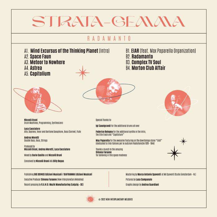 Strata-Gemma lands for the first time on Simona Faraone's label, New Interplanetary Melodies, with their third album: Radamanto. The trio, comprised of DJ and record producer Niccolò Bruni, musicians Luca Cacciatore and Andrea Moretti, masterfully blend jazz, electronic music and otherworldly atmospheres. Radamanto is a beautiful album, crooked, dense and vibrant, in which jazz, psychedelia, experimental electronics and more, elegantly merge for a nocturnal journey full of smoky suggestions.