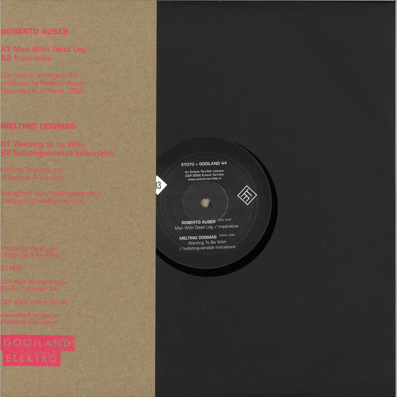 This two sided split record between Roberto Auser and Melting Dogmas is a showcase of two sides of contemporary elektro… on one side there is the music of electro veteran Roberto Auser… his modular synth sounds are minimal electronics and 80’s inspired… but these two tracks are a bit different then the beat driven music he released mostly these past few years… despite his recognizable sound these two tracks deliver something new to his repertoire… less beat driven but still very much rhythmic… some industrial and pulsating sounds keep these tracks going and even suitable for the dancefloor late at night or early in the morning… I wish for more of this from Herr Auser! Melting Dogmas is 4Cantons together with Numèric… if you are familiar with the debut EP by 4Cantons then you will recognize his dark elektro sound… but these two debut tracks of Melting Dogmas are a bit more complex… without losing their club minded attitude… the sounds of Melting Dogmas is idm driven with elektro and techno elements all there in a perfect mix and maybe even making these tracks punchier as the music by 4Cantons… and at the same time also a bit more daring… the structure is less straight forward with a good balance between building up the tension and full out beat parts… just like 4Cantons I cannot recommend enough to keep an eye out for Melting Dogmas… it is very hopeful to have musicians like this around with such good and daring sounds…