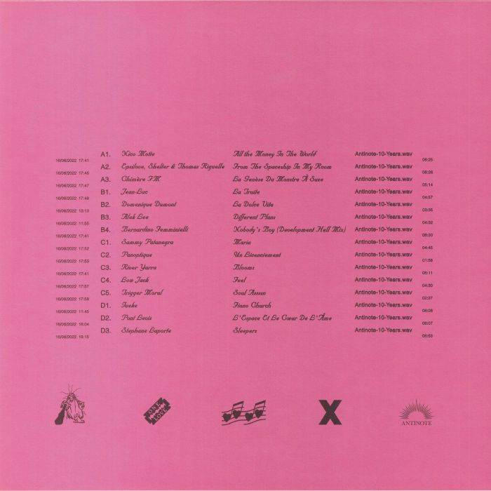 There’s obviously more to "Antinote X" than the sum of its parts, and Jean Luc’s post-Plantasia jazz hybrid (“La Truite”), Arabica’s decadent, anti-colonial spoken number (“Multo Storia") or fellow Antinote in-house visual designer Nico Motte’s vintage disco churner (“All The Money In The World”) are there to attest. Not to forget Panoptique, up with a lashing, dissonant treat for the senses (“Un Licenciement”), Leo Martelli under guise as Sammy Patanegra with a tribal jacking weapon (“Maria”), Pont Levis floating into emotional hyperspace (“L’Espace et le Coeur de L'Âme”), Trigger Moral in with a marvel of a hip-hop gem emerged from some retro-futuristic wormhole (“soul assssn”) and Laporte rounding it off downtempo, modular ambient style for good measure (“Sleepers”). Ten years on, Antinote still leading the pack.