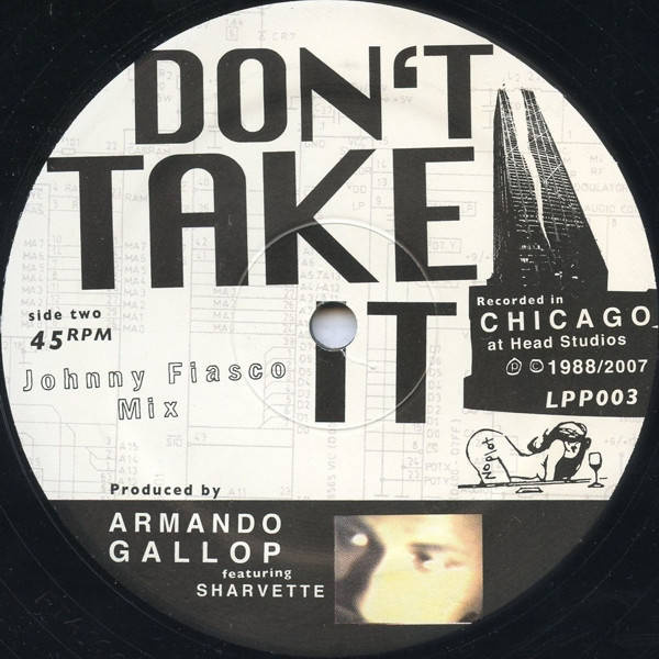 "Don't Take It", is an improvised, one-take after-party session from 1988 by Armando Gallop, featuring Sharvette. This flip on this Let's Pet Puppies release is an unbelievable extended instrumental re-rub from Johnny Fiasco.