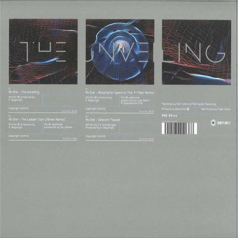 Kirk Degiorgio is becoming somewhat of a mainstay on the Belgian De:tuned label. Here he returns with 'The Unveiling'. The title track stands out with a classical synth progression and beautiful harmonies, resulting in an uplifting Detroit fused techno cut. 'Descent Module' takes you on a driving acidic trip and has all the characteristics of a hypnotic floater for the after-hours. On the flip you'll find two exclusive remixes from Kirk's 'Communion' album on De:tuned. Ian o'Brien showcases his vast musical talent and opens up his soul with a warm and lengthy retake of 'The Ladder'. Luke Slater debuts strongly on De:tuned and provides a rare The 7th Plain remix of 'Absorption Spectra'. Luke's take is a sentimental and lush ambient techno interpretation where its unique sound oscillates between a melancholic state of nostalgia and modern escapism.