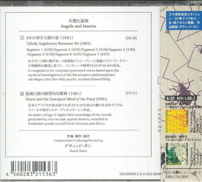 This is the 30th anniversary CD reissue of an amazing and all-encompassing album by American composer and sound artist David Dunn, highlighting two extremes of communication: the supernatural, celestial names of angels; and the natural, subaquatic world of pond insects. EM Records is currently researching the rather unexplored domains of what can be called cyber-occult music, with an emphasis on the hidden, the enigmatic, the arcane; this release can be located at a distant edge of this area of interest, in its use of technology to give us access to previously unheard communicative phenomena. Dunn’s interest in the broad contexts of communication finds links between macro and micro, heavenly and earthly, music and environmental sound. Dunn sees these pieces as a human effort to respect and perhaps comprehend the non-human universe. The angels of the title are based on Renaissance attempts, by occultists John Dee and Edward Kelly, to communicate with angelic beings. The insects are aquatic creatures, recorded with hydrophones in North American and African ponds.