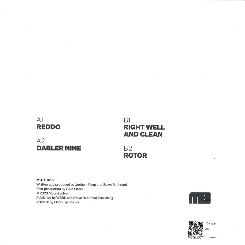 The intense and textural 'Reddo' kicks off with industrial synth lines designed for maximum warehouse impact before 'Dabler Nine' brings its deep rolling drums and mind-melting synth lines late into the night. 'Right Well and Clean' has fresh, airy kick drums rolling beneath harsh and icy hi-hats before 'Rotor' closes the release in cosmic fashion with spiralling pads and intensely layered synths and drums.