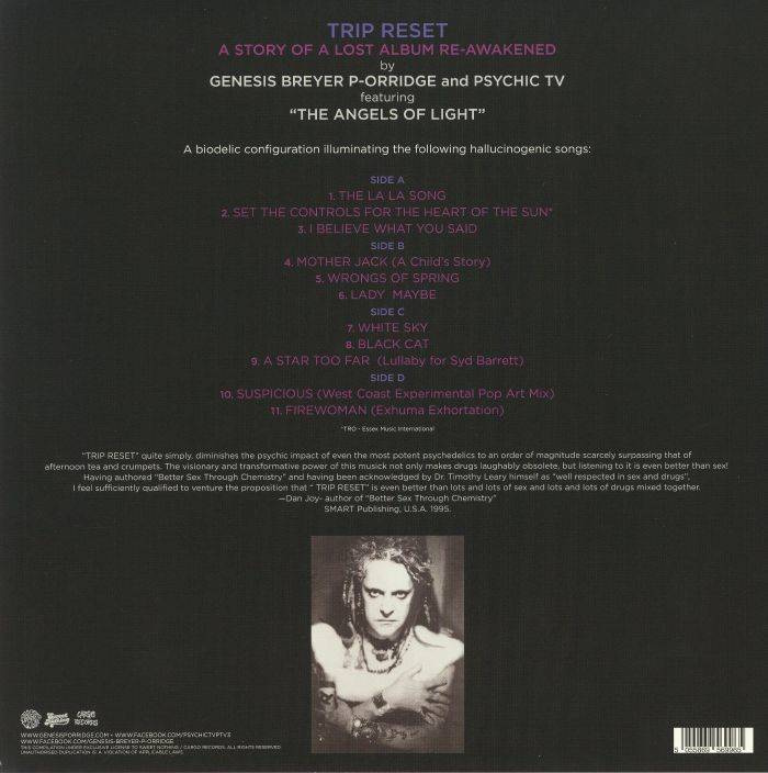Limited edition two LP set on purple (A&B) and silver (C&D) vinyl. First time on vinyl. Originally released on CD only in 1996 – Features full lyrics and extensive liner notes from Genesis Breyer P-Orridge. TRIP RESET - A STORY OF A LOST ALBUM RE-AWAKENED by GENESIS BREYER P-ORRIDGE and PSYCHIC TV featuring“THE ANGELS OF LIGHT” A biodelic configuration illuminating thefollowing hallucinogenic songs.