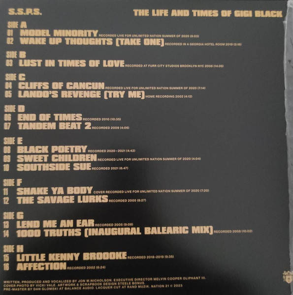 Now, many years later we see the culmination of his electronic works from 2002-2021 committed to record in this 4xlp, 16 track boxed set (plus 45 page booklet) titled SSPS, "The Life and Times of GiGi Black" thus solidifying Mr. Nicholson's place in the secret world of dance not dance music.