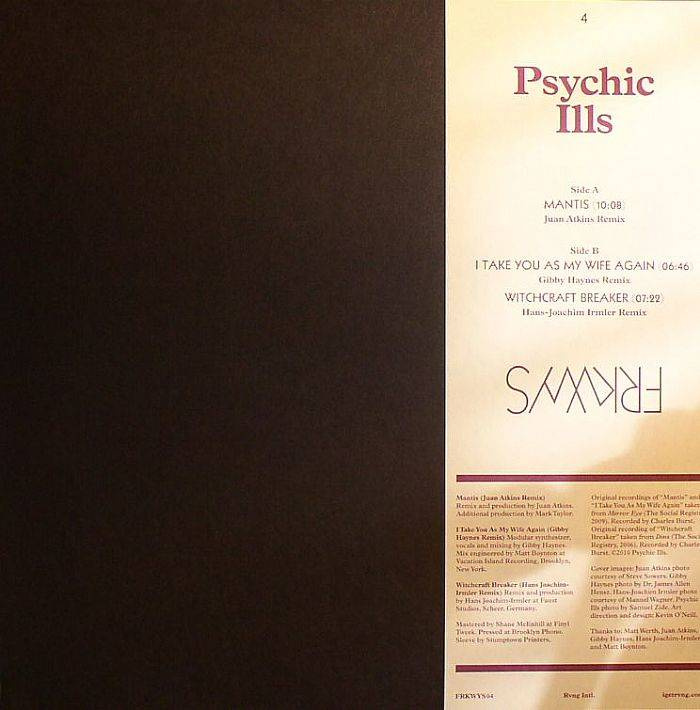 Cult avant gardists Psychic Ills are the focal point of the latest FRKWYS release from RVNG INTL. For this project the band approached artists who reflect important chapters in the formation of what we now call electronic music. Some twelve months later we have the finished product, gloriously presented as ever, with a sleeve design that imitates a vintage photo album. Detroit legend Juan Atkins was seemingly contacted on a whim and jumped at the chance to transform the sprawling psychedelic drone of ''Mantis'' into an equally hypnotic near ten minute box jam which brilliantly utilises the sliding guitar and menacing bass. Gibby Haynes from Butthole Surfers was entrusted with the K hole darkness of ''I Take You As My Wife Again'' and delivers a reimagination that grips your attention thanks to the muddle of strings and oscillating synth arrangements. Finally the criminally short ambience of ''Witchcraft Breaker'' is stretched out and drowned in a wall of industrial strength sound by Hans-Joachim Irmler, founding member of German kraut-fathers Faust.