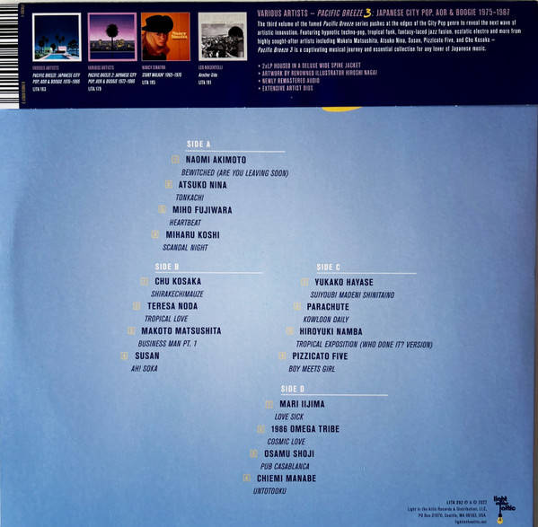 This volume of Pacific Breeze, like its predecessors, is a female-forward offering with many tracks being voiced by women who would become household names in Japan as actresses and pop idols. Their songs here subvert the norm and brim with an innovative spirit that shatters gender roles in favor of sonic transcendence. Techno-pop classics from Susan, Miharu Koshi and Chiemi Manabe sit alongside sublime funk from Atsuko Nina and Naomi Akimoto while Teresa Noda slides into the mix with a sultry reggae jam. The genre span is stretched wider with hypnotic jazz fusion by Parachute and Hiroyuki Namba, a synthesizer fantasy from Osamu Shoji, and magnetic pop by Makoto Matsushita and Chu Kosaka.