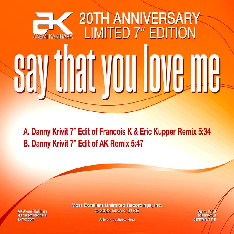 With 7' vinyl singles currently enjoying a renaissance, Krivit suggested AK revisit the landmark track to do another re-work of 'Say That You Love' for Most Excellent Unlimited, something noticeably different from the original. AK's new version of her signature tune retains her silky vocal refrain that first seduced listeners, but adds a bubbly keyboard melody and a propulsive snare kick that turns it into a dance floor stomper. Krivit then edited down her new production and the Francois K mix for the first time on 7" release; he felt the song's King Street hit remix arrangement was very strong, so he did his best to maintain it's hit arrangement within the restrictions of a 5:30 min format for the flip side of the single. The result is a must-own 7' that sounds both classic and contemporary at the same time.