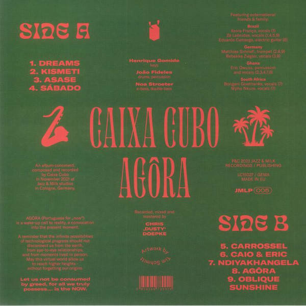 Last seen effortlessly fusing bossa-nova, broken beat and soul-jazz on Heavenly Recordings (2021's excellent 'Angela'), Caixa Cubo pops up on Jazz N Milk with a pleasingly summery, sun-splashed set. The Brazilian trio's trademark sound naturally draws on their love of samba and the jazz-fusion excellent of countrymen Azymuth, but also touches on deeper and dreamier shades of nu-jazz, the jazz-funk exploits of Herbie Hancock, percussion-rich Afro-jazz, and sumptuous downtempo grooves. It's great listening music, with the core trio frequently serving up music that sounds bigger and more expansive than you'd expect from such a slimmed-down line-up. Recommended!
