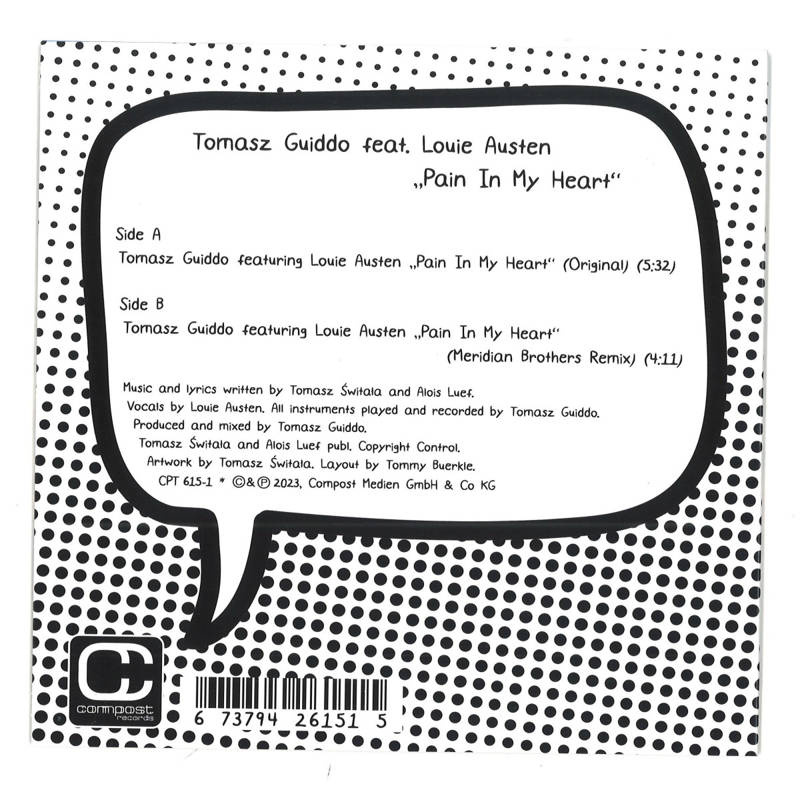 Super bitter-sweet ballad. Like 70% cacao chocolate. Tomasz Guiddo teams up with legendary Vienna crooner Louie Austen (remember all his hits on Cheap, KittyYo, Tirk, G-Stone, Klein Records, Etage Noir). On the flip side of this 7" the Columbian superdons Meridian Brothers turn this into real mambo madness, which gives the ballad a joyful twist.