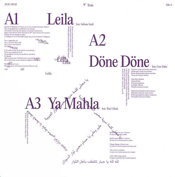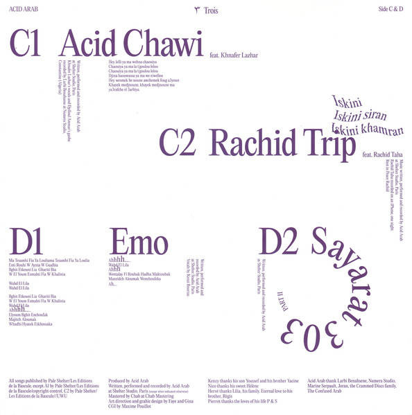 Franco-Algerian collective Acid Arab are releasing their third album, "Trois". The ten tracks on this eagerly-awaited record are serious dancefloor bangers, and will also be providing delightful private listening experiences, thanks to their sophisticated production and to the intriguing, diverse performances by eight guest vocalists from North Africa, Syria & Turkey: Wael Alkak, Cem Yildiz, Ghizlane Melih, Khnafer Lazhar, Sofiane Saidi, Fella Soltana, Cheb Halim & Rachid Taha. Algerian gasba, Anatolian trance, synthetic dabkeh, bionic raï... Acid Arab have incorporated and invented a spectrum of styles, breaking boundaries between genres. After spending close to ten years exploring diverse types of music through their numerous collaborations and their constant travels all around the Mediterranean and beyond, Acid Arab keep pushing the envelope and expanding their musical territories. "We"re careful not to repeat a identical formula from album to album" says the band. "It"s the actual working relationship with the guest artists which drives us to expand the concept."