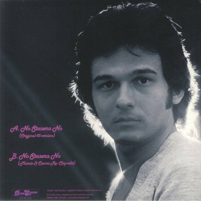 “No, Stasera No” was originally released as a 7” in a few hundreds copies with no cover, handed out as a promotional tool in order to publicize Sal and Giovanni’s own label “Piuma”, when they decided to step into production. Timing didn’t help the fate of this 7”, as it got released in 1981, at the very end of the golden era of disco music, letting it disappear into obscurity and making it a super sought-after disco holy grail.