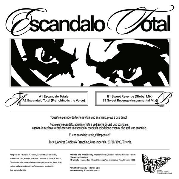 In the rich legacy of '90s Italian clubs there's a region and, especially, a place that had its own set of rules. Club Imperiale was located in Tirrenia, on the coast of Tuscany. Its legendary parties, called "Mezzanotte Mezzogiorno” (Midnight Midday), were huge dj marathons that included the cream of local selectors such as Francesco Farfa, Robi J, Miky the Dolphin, Rick 8, and more. In 1993, what became one of the club’s anthems was produced: “Sweet Revenge” was composed by the Falsini brothers and by one of the resident djs, Andrea Giuditta. The EP was released on Interactive Test and its peculiarity was the participation of Club Imperiale’s vocalist Franchino on one track. Thirty years later, Evasione Digitale brings back four tracks of pure Tuscan Progressive bliss! The reissue includes the three tracks from the original EP and another version of “Escandalo Total,” previously only available on a limited promo release from Interactive Test.