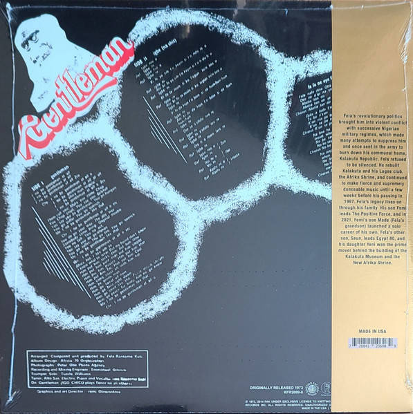 The title track of this excellent album has often been hailed as Fela's masterpiece. Musically innovative, melodically addictive, Fela got it all right in this politically scathing song in which he opposes Westernization and those who imitate Western ways. "I'm no be gentleman at all", Fela sings, and then goes on to detail the ways in which he's a true African origina and therefore superior to those who wear three-piece suits and hold tight to their colonial mentality. Fela follows this track with Fefe Na Efe, which derives its name from an Ashanti proverb describing the beauty of a woman holding her breasts as she runs. Fela, who had many Ghanaian fans (and more than a few Ghanaian wives and girlfriends), sings this lush track as a tribute to Ghana. Finally, 'Igbe' again shows the artist breaking cultural taboos by singing literally and figuratively about 'shit', as the word translates to, attaching the word to those friends who may betray you.