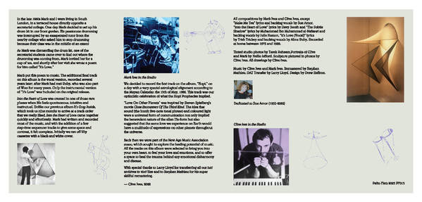 A cosmic testament to the healing power of love, utilizing vocoded clarinets, pastoral guitars, homespun folk lullabies, and lilting electronics, coalescing into a an hour plus long journey through their otherworldly soundscapes. A prime entry point to Woo’s sound, containing some of their most beloved songs, such as ‘Make Me Tea,’ ‘It’s Love,’ ‘Hopi’ and many others, and also including a never-before heard bonus track – the vocal version of ‘It’s Love.’ Into The Heart Of Love was originally self-released on cassette in 1988, with a wider cassette release in 1990. Compiled from home recordings from the preceding years, and released during a transitional point for the band, the Ives brothers see this album as their most complete work, offering space to the listener to stretch out and immerse themselves into the warmth of their sound.