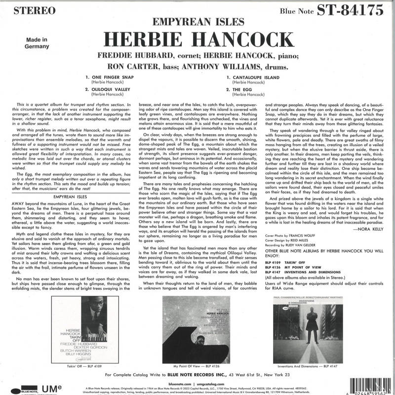 Herbie Hancock debuted on Blue Note in 1962 and quickly established himself as both a remarkable pianist and a brilliant composer with three excellent albums—Takin’ Off, My Point Of View, and Inventions & Dimensions—before making what is widely considered to be his first masterpiece: Empyrean Isles. Recorded in 1964, the album seemed to distill the full breadth of Hancock’s artistry into a sweeping 35-minute musical journey. Joining Hancock on the voyage were three of his closest collaborators: trumpeter Freddie Hubbard and Hancock’s Miles Davis Quintet bandmates Ron Carter on bass and Tony Williams on drums. Each of the four distinctive original pieces Hancock composed for the date occupies its own unique space. The quartet launches into the album opener “One Finger Snap” which consists of a single opening line that leads directly into blistering improvisations by Hubbard and Hancock. The first side concludes with the beguiling “Oliloquy Valley” which conjures a mysterious and mystical vibe. The flipside leads off with one of Hancock’s most enduring themes, “Cantaloupe Island,” with its undulating groove and unforgettable melody, before moving into a more exploratory realm with “The Egg,” an expansive 14-minute epic that flirts with the avant-garde and gives ample space for the musicians to let their imaginations run wild.