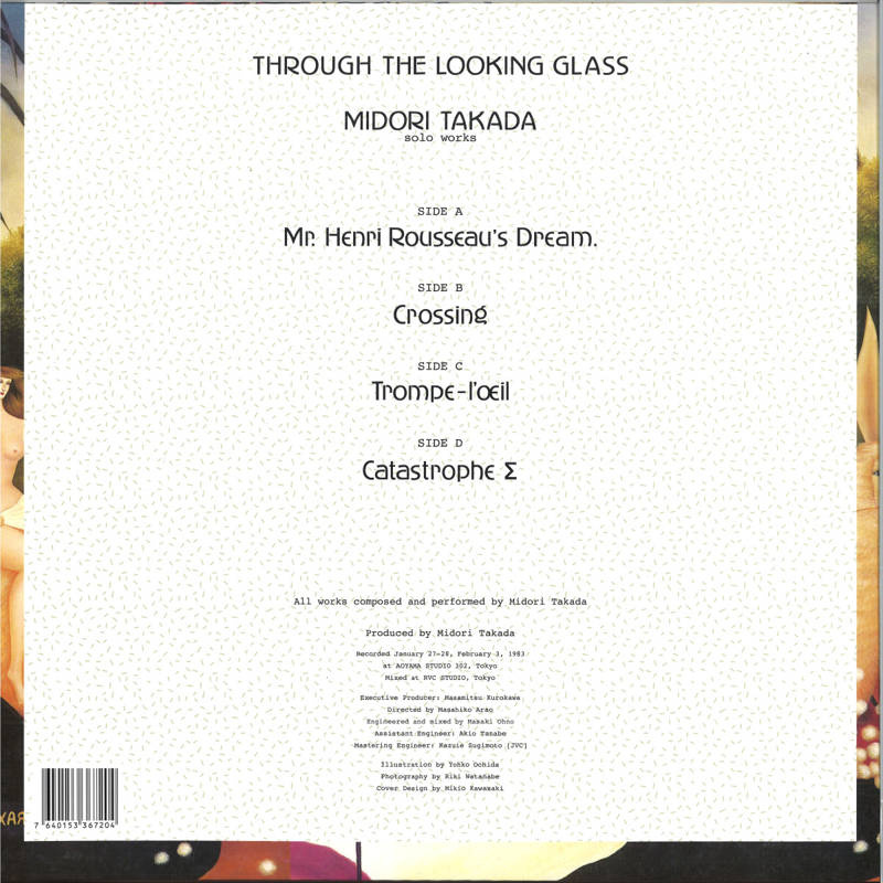 Considered a Holy Grail of Japanese music by many, "Through The Looking Glass" is Midori Takada's first solo endeavor, a captivating four-song suite capturing her deep quests into traditional African and Asian percussive language and exploring contemplative ambient sounds with an admirably precise use of marimba. The result is alternatively ethereal and vibrant, always precise and mesmerizing, and makes for an atmospheric masterpiece and an unparalleled sonic and spiritual experience.