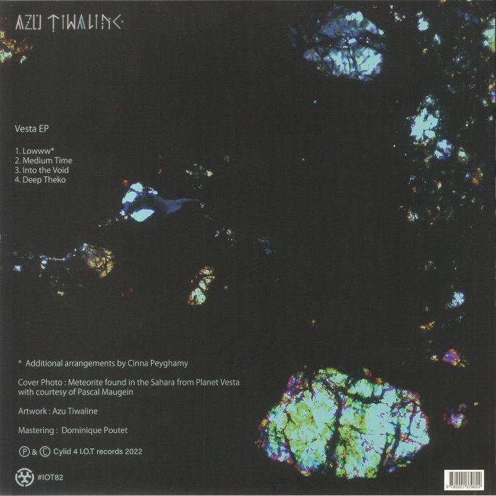 It was an encounter with one of these fragments that inspired the name for Azu Tiwaline’s latest EP for I.O.T Records, ‘Vesta’, which features tracks that were written and recorded around the same time as ‘Magnetic Service’, her break-through EP for Livity Sound. Holding a piece of Vesta that had been found in the Saharan Desert - already a place of deep significance for her - she felt a sense of wonder, on a cosmic scale. In her hands, was an object so apparently familiar, of the same age and made of the same fundamental materials as the Earth on which she stood, yet from somewhere else entirely. A perfect name for the four tracks that make up ‘Vesta’. And also the perfect source material for the EP’s cover, an electron microscope image of a razor-thin slice of that same cosmic fragment that Azu held in her hand.