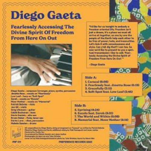 "Fearlessly Accessing the Divine Spirit From Here on Out" is the vinyl debut from pianist, composer, and producer Diego Gaeta. He has previously released projects as Club Diego and with the trio Human Error Club (whose members Mekala Session and Jesse Justice helped produce this record). He has quickly become a fixture in a number of Los Angeles musical environments, working with Lionmilk, The Pan Afrikan Peoples Arkestra, Carlos Niño, Black Nile among others. This album is a synthesis of these many LA environments, and carries chamber, jazz, ambient, and folk influences, ultimately giving it an uncategorizable feel similar to works by Arthur Verocai or David Axelrod.