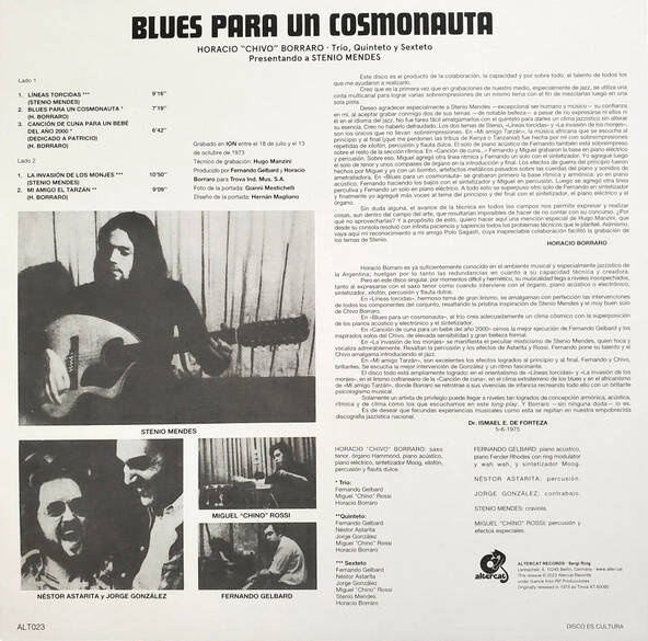 Horacio Chivo Borraro is an Argentine saxophonist who toured with many bands and artists in the 1960s and 70s. His album Blues Para Un Cosmonauta is a curt four-tracker of naive-not-naive free jazz and avant-garde spiritualisms, all of which, in theme, collapse the boundary between actual space exploration and that of the figurative astral plane. A comparatively rare jazz record, now reissued in greater numbers, its mystique is backed up by its musical dubiousness, with quizzically trilling synths on the title track, or the potent and full-bodied electric pianos on 'Cancion De Cuna Para Un Bebe Del Ano 2000', spreading both confusion and delight.