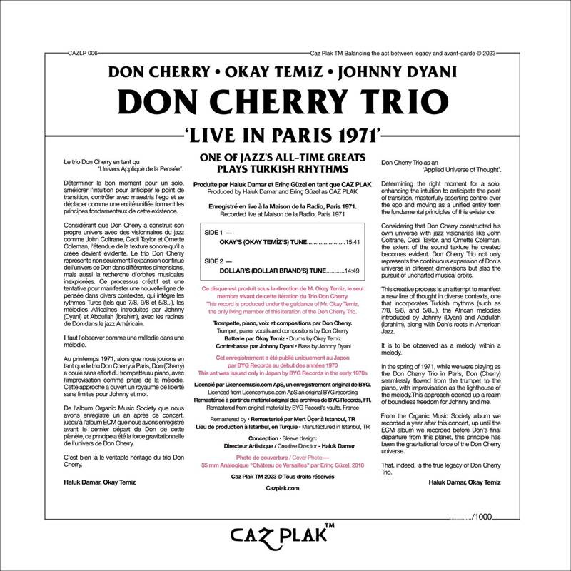 This LP features the recording by the Don Cherry Trio in Paris 1971 for the Sound and Vision program at the legendary ORTF studios in Paris 1971. Serving as the second chapter of our 'Turkish Jazz Trilogy', it follows Okay Temiz's magnum opus, 'Okay Temiz's Oriental Wind at Montreux Jazz Festival 1982' LP. We present one of the paramount Jazz figures of all time interpreting Turkish rhythms in Don Cherry Trio - The ORTF Recordings Paris 1971 LP