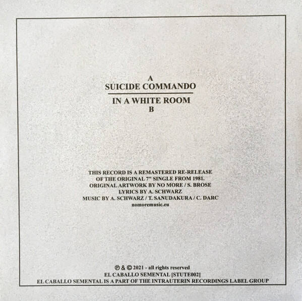 No More were a seminal German minimal wave group from Kiel who made their name in 1981 with the single 'Suicide Commando'. Centered around Andy A. Schwarz and Tina Sanudakura, their sound is everything you want from lo-fi DIY synth music in the post punk era - icy cold, propulsive, grainy but shot through with fuzzy warmth from those gnarly synth lines. The track has attained a reputation through the decades thanks to the likes of DJ Hell remixing it and Mannequin Records doing an extensive repress of the 1984 12" release, but now El Caballo Semental have returned focus to the original 7" pressing, faithfully capturing the stark and spooky feel of the sleeve and reviving the forgotten B-side, 'In A White Room'.