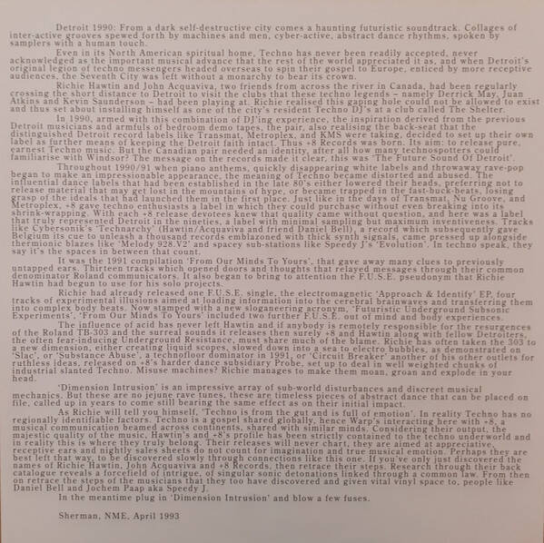Richie Hawtin's early music was undoubtedly a product of his surroundings in Windsor (the Canadian one) and Detroit, but over time a more European dimension to his sound emerged which naturally aligned with the developments taking place at Warp. When the Artificial Intelligence series came together, Hawtin's approach was certainly tipped more towards techno in the American sense of the word, but his pointillist beats and synth sequences on Dimension Intrusion slotted in comfortably between Speedy J, Polygon Window and Autechre. Not just a horizontal home listening affair, there's plenty of rave teeth to tracks like 'F.U.' and 'Substance Abuse', as he demonstrated his gift for telling vivid, narcotic stories with the 303 and 909. Now, the album has finally remastered and reissued, sounding the best it ever has and released alongside a new edition of Speedy J's equally seminal Ginger.