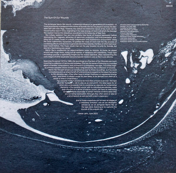 The Sum of Our Wounds (Cassette Recordings 1973-85). The archetypal Martin Rev sound, a perennial influence on generations of musicians, is most prominently in evidence in the works of Suicide, the duo he played in across the decades with with Alan Vega. However, the radical and distinctive nature of his music can be traced further back in time, originating in the base energy of rockOnOroll which the teenage Rev experienced as the ubiquitous soundtrack to his home city of New York.