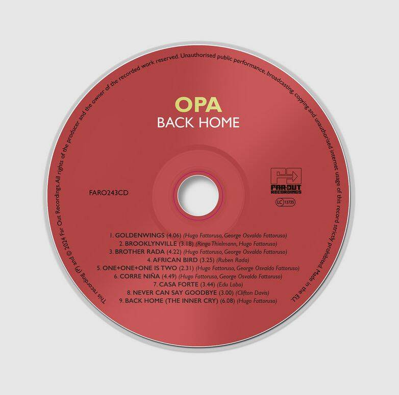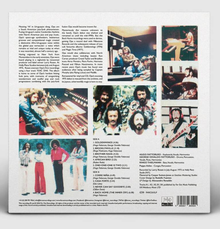 Opa's Back Home was first reocrded in 1975 but not released until 1996; it was the fourth and final album by the esteemed Uruguayan fusion band, whose preferred admixture was usually some melted pot of funk and samba, making for an impressive heuristic building on their intuitive recalling of their mutual upbringing in South America. Mysteriously (for reasons unknown to the band), Opa's debut was shelved and remained so until the mid-1990s. But the story goes that it was recorded after renowned label producer and owner Larry Rosen heard the band playing in a Brooklyn nightclub; with this in mind, Back Home makes for an ironic title, since the sonic turn expressed by the band is not one of homesickness, but rather that of an immersion in New York's metamorphous music scene ('Brooklynville' has an instant proto-hip-hop vibe, if not for its original urban field recording, then certainly for its bulbous broken funk twang). Now reissued on vinyl and CD via Far Out, you won't want to miss this round trip.