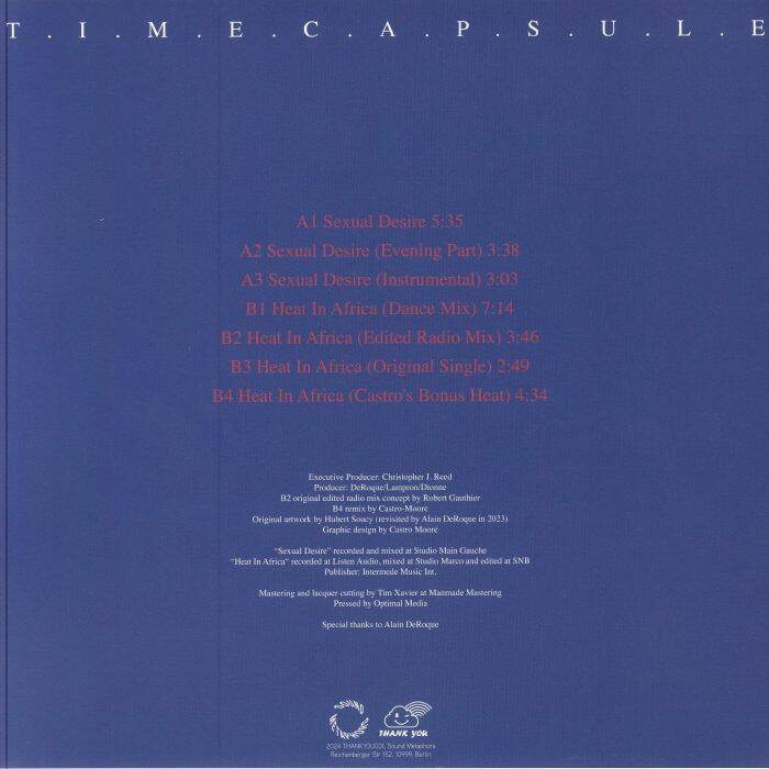 An interesting insight into some of the diverse dancefloor oriented sounds going on in Canada during the 80s sitting somewhere between electro, italo disco and proto house. A-side starts off on a slow paced 80 bpm pop/rock italo-disco crossover track featuring lyrics in english with an unidentifiable accent, very much reminiscent of Italian local neighbourhood private press ventures featuring someone's sister on the vocal. 3 versions later, on the B side, things step up a notch coming in at 130 bpm with "Heat In Africa's" drum machine propelled rhythmic mayhem pulling out all the latest studio bells and whistles of the time. Big electric guitar solo build up on the "Dance Mix" and additional Bonus Beats mix by Castro. Remastered and officially re-released almost 4 decades later.