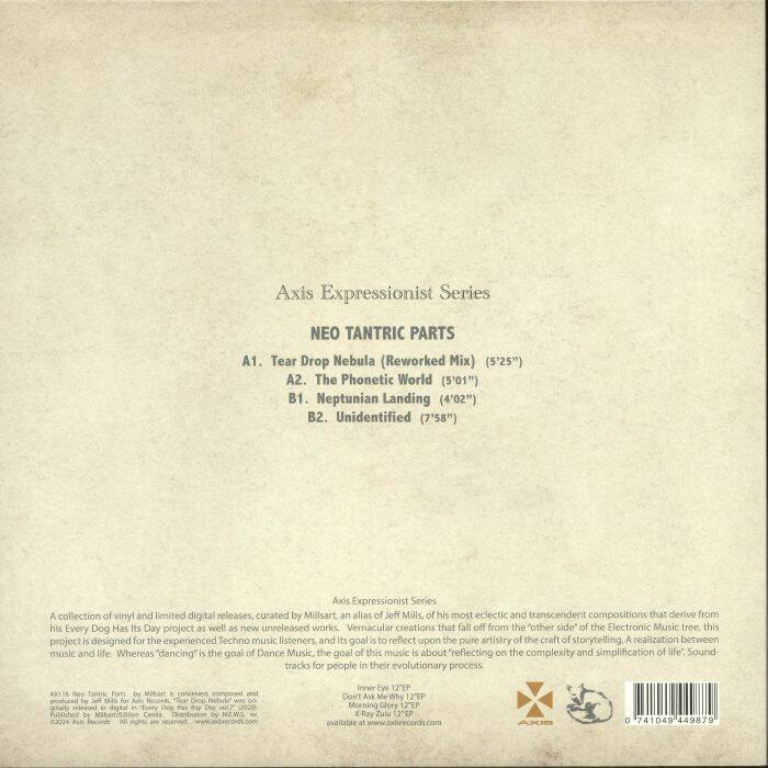 Jeff Mills continues to gift us some utterly astounding house-tempered work from the Millsart project on this latest 12". Neo Tantric Parts draws from the deep well of Millsart archives, with 'Tear Drop Nebula' especially benefitting from a new mix as it shuffles percussion and vibraphone chimes around microtonal cascades which give the music a particularly giddy quality. 'The Phonetic World' has a punchy presence without losing that lighter style Mills adopts under this alias, while 'Neptunian Landing' heads into spookier territory with some faithful 909 hats for guidance. Watch out for 'Unidentified' though, a truly tweaked-out slice of space lounge gear for watching the walls of you mind melt after one too many solar flares.