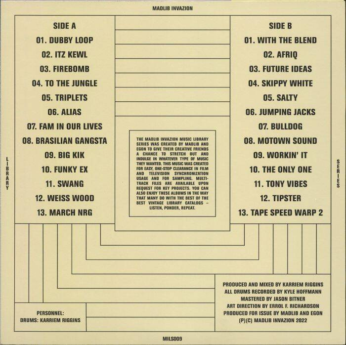 The Madlib Invazion Music Library Series Entry #8: Karriem Riggins’ To The Jungle. Riggins is the type of drummer whose power and finesse shakes even Malcolm Catto. If you know what that means, this is the album for you. The Madlib Invazion Music Library Series was created by Madlib and Egon to give their creative friends a chance to stretch out and indulge in whatever type of music they wanted. This music was created for easy, one-stop clearance in film and television synchronization usage and for sampling. You can also enjoy these albums in the way that many do with the best of the best vintage library catalogs – listen, ponder, repeat.