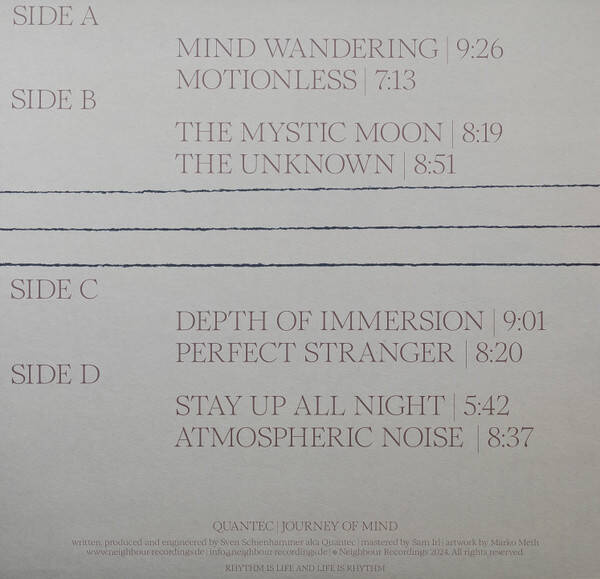 Neighbour Recordings has decided to reissue this enthralling ambient dub masterpiece from Quantec and we're here for it. Journey Of Mind delves into the depths of electromagnetism and showcases Quantec's deeper side in cuts like 'Depth Of Immersion', 'Atmospheric Noise', and 'The Unknown'. Each track serves as a potent tool for self-introspection, with standout pieces like 'The Mystic Moon' offering a visceral journey through the mind's deepest and darkest corners. As such this album, with its pulsating rhythms and ethereal atmospheres, is one that proves the perfect soundtrack with which to explore the uncharted realms of consciousness and perception.