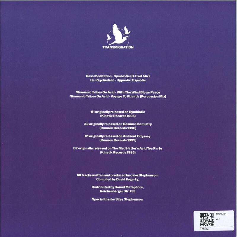 Transmigration opens the vaults of prolific UK psychedelic producer Jake Stephenson, compiling a selection of his rarest and most sought after tracks including the Detroit inspired acid techno track "Symbiotic" and two previously CD only productions under the alias "Shamanic Tribes On Acid". Licensed in collaboration with the Stephenson family and remaster by ManMade Mastering.