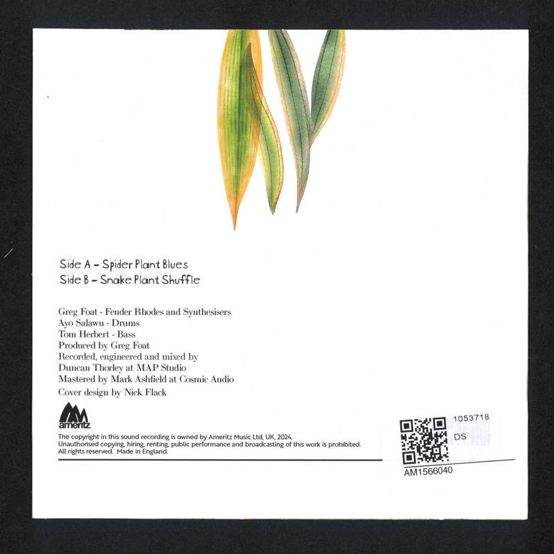Snake Plant Shuffle and Spider Plant Blues are inspired by the the plants on Gregs bedside tables - which periodically move around the house dependent on his mood. The plants provide a good source of oxygen in the room and create a calm soothing atmosphere for Gregs musical projects. Together the tracks feature live drum kits by Ayo Salawu, Fender Rhodes and a plethora of Vintage Synthesisers.