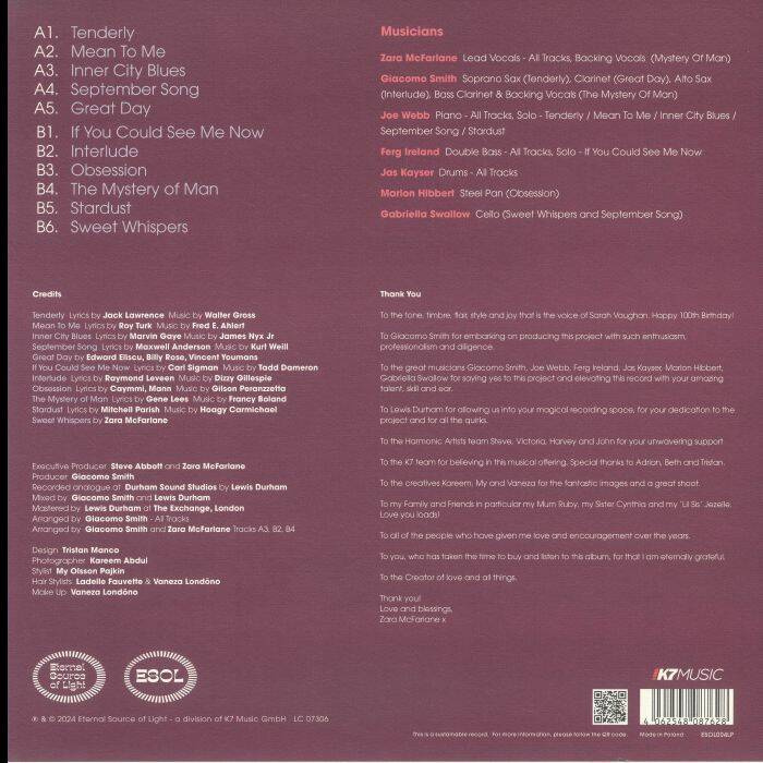 Zara McFarlane said “It was when I started to listen to Sarah Vaughan that I really began to appreciate jazz vocals. She had such control across her range and a vocal command that was cheeky, playful and fun yet sophisticated and articulate. I really wanted to pay homage to her as I feel she has been somewhat overlooked amongst the jazz singers. Although I do love Ella and Billie, it's all about Sarah for me.”