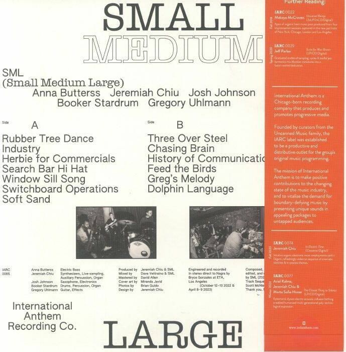 The venue, perhaps best known outside of LA for Jeff Parker's 2022 album 'Mondays at the Enfield Tennis Academy', was the perfect location for the start of SML, especially given that both bassist Anna Butterss and saxophonist Josh Johnson are part of Parker's quartet that held down a regular gig at ETA since the venue's early days (and hence thoroughly documented, heard on Parker's album). 'Small Medium Large' was engineered and recorded in stereo direct to Nagra by Bryce Gonzales and compiled, arranged, and edited with additional production, recording, and studio composition by SML across their various home studios.