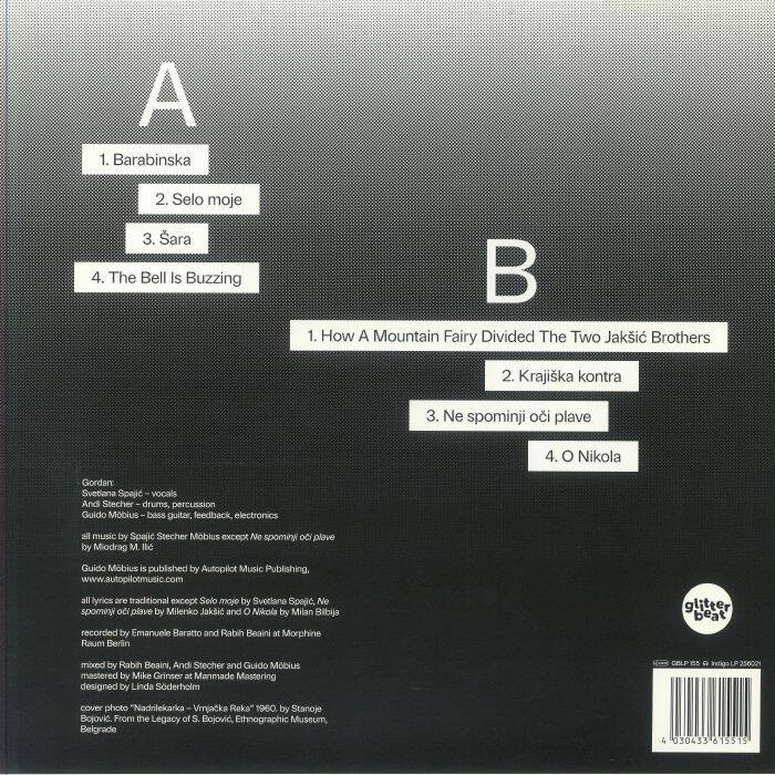This self-titled 2nd album from Gordan, the acclaimed transnational (Serbia/Germany/Austria) experimental trio, fuses traditional Balkan vocalizations with feedback, electronic sound generators, pulsing bass and hypnotic drumming. Gordan mirrors the mysticism of legends and stories from the Balkan region, creating a music that stretches between expressiveness and abstraction; tradition and the avant-garde. The visceral vocals of Svetlana Spajic (Marina Abramovic, Lenhart Tapes, Antony and the Johnsons) are both rooted and deeply interpretive. In turn, drummer Andi Stecher (STECHER, Billy Bultheel, Orchestre Les Mangelepa) and Guido Moebius on bass and electronics, employ sonic strategies that steer the songs in inspired and unpredictable directions.