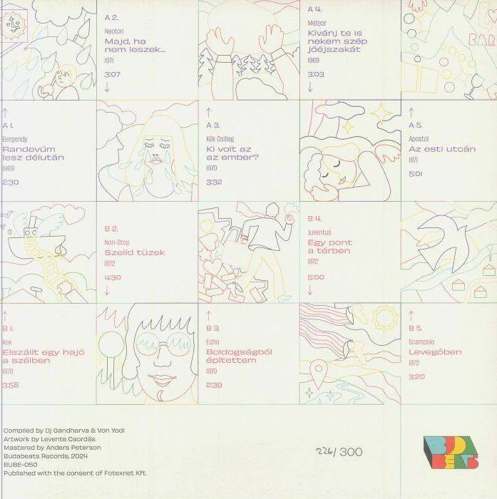 There was, however, an undercurrent of smaller semi-professional bands striving to succeed in the shadow of the very few stars privileged by the sole state owned record company. Given their chances to release music were at best limited to a few 7“ singles at the mercy of said record company powers. Psyched Out Grooves from Hungary compiles ten of the most outstanding singles recorded by the underdogs of this period. Some of the bands featured on here have eventually reached wider success by switching to more commercial styles, like Bergendy, Neoton, and Apostol. Most, like Echo, Meteor, Kék Csillag, Non-Stop, were temporal formations that dissolved after a few years due to personal conflicts, lack of success, or both. Others, like Scampolo or Juventus, lasted a longer time without an actual break through. Most of these bands never had a consistent, lasting ’psychedelic’ repertoire or identity at any point. These tracks were the exception, not the norm. That coherence - the illusion of a scene - comes from the curation and sequencing of Budabeats head honchos Von Yodi and Gandharva. It is the arrangement of these puzzle pieces that makes them fit together.