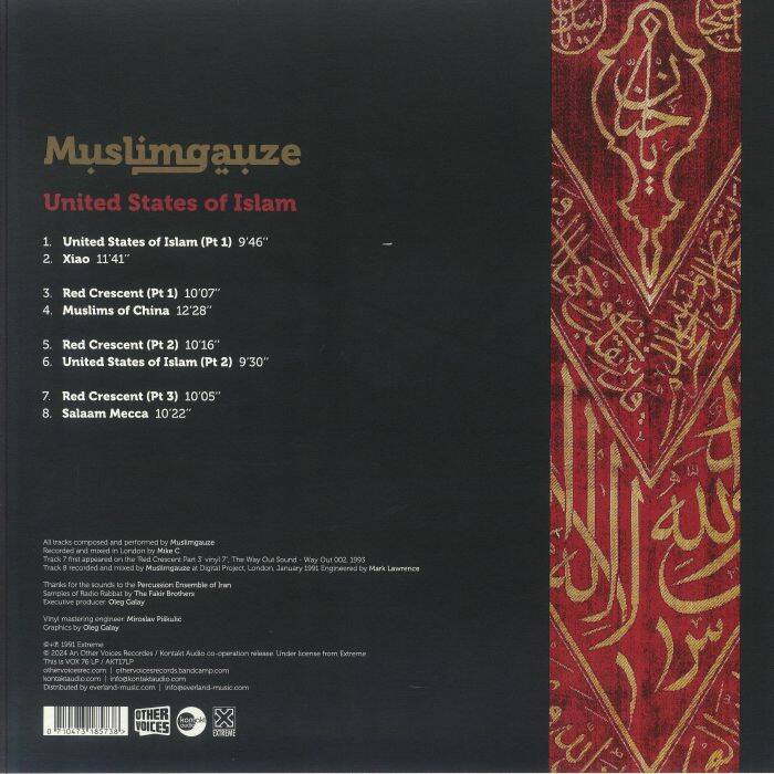 United States Of Islam is the second part in a series of 4 outstanding double vinyl albums with bonus songs, previously released on CD between 1990 and 1994 on the Australian cult label Extreme Music. Armed with a cleverly provocative title, USoI showcases a moodier side of Muslimgauze. While the trademark blend of driving percussions and minimalism reigns supreme as always, the general feel is much more dreamy and mysterious than on some of Bryn Jones’ more forthright pieces.