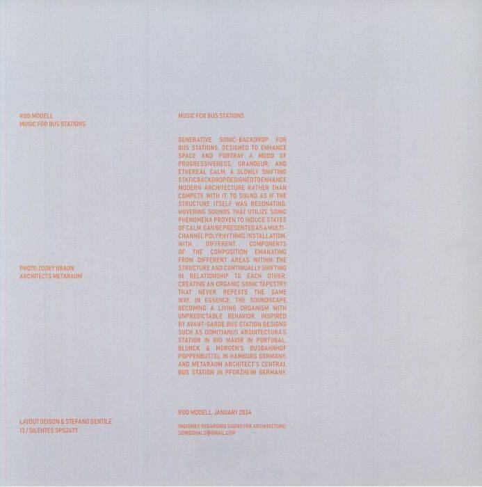 "Generative sonic backdrop for bus stations. Designed to enhance space and portray a mod of progressiveness, grandeur, and ethereal calm. A slowly shifting static backdrop designed to enhance modern architecture, rather than compete with it. Sounding as if the structure itself was resonanting. Hovering sound-fields that utilizes sonic phenomena proven to induce states of calm. Can be presented as a multichannel, polyrhythmic installation with different components of the composition emanating form different areas within the structure, and elements constantly shifting in relationship to other elements, creating an organic sonic-tapestry that never repeats the same way. In essence, the soundscape becoming a living organism with unpredictable behavior. Inspired by avant-garde bus station designs such as Domitianus Arquitectura's station in Rio Maior, Portugal; Bluck & Morgen's Busbahnhof Poppenbuttel in Hamburg, Germany; and Metaraum Architect's bus station in Pzorzheim, Germany."